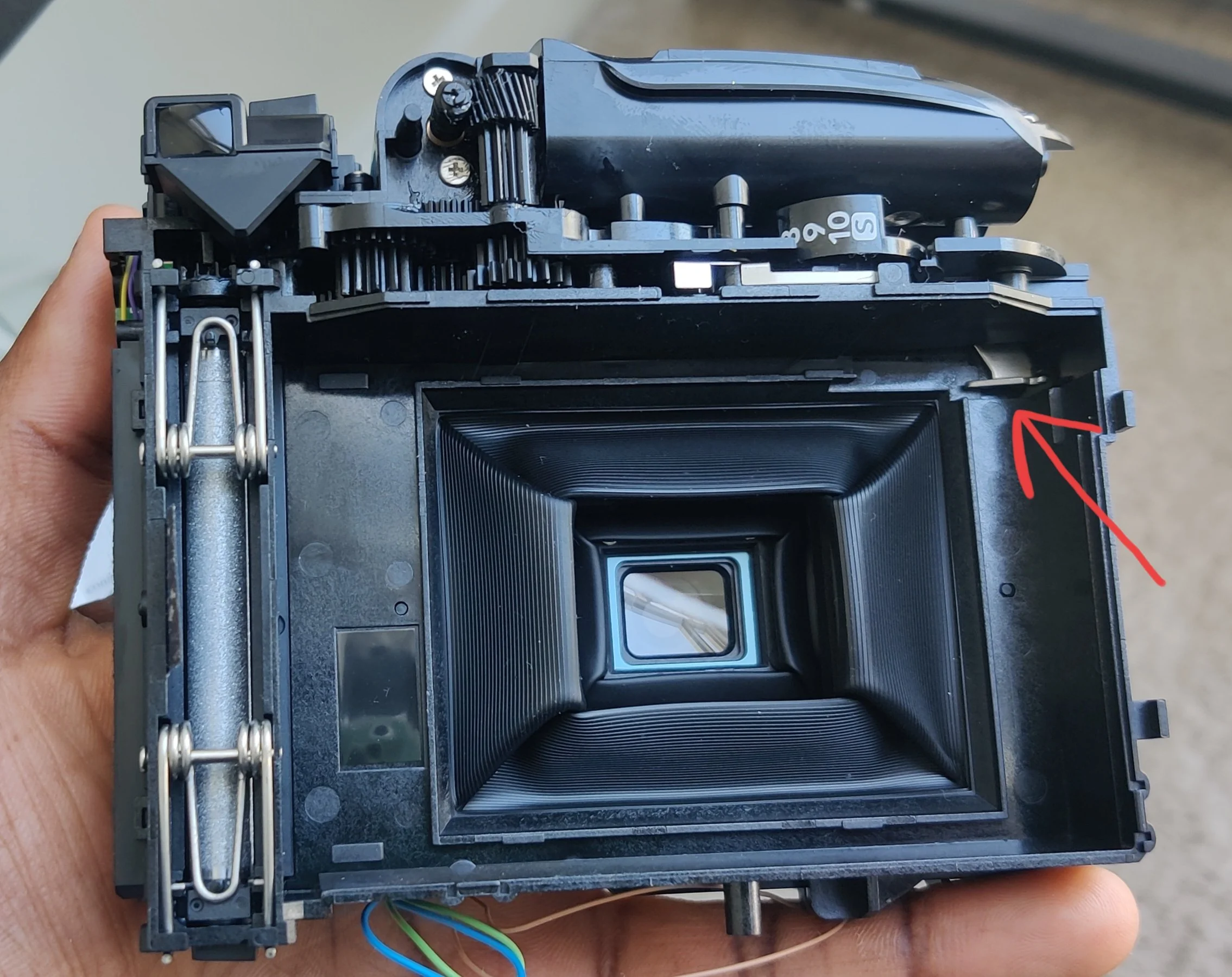 The silver lever (marked red in Figure 5) is the claw that slides along the length of the camera by around half an inch to push the photo film and pop it out.